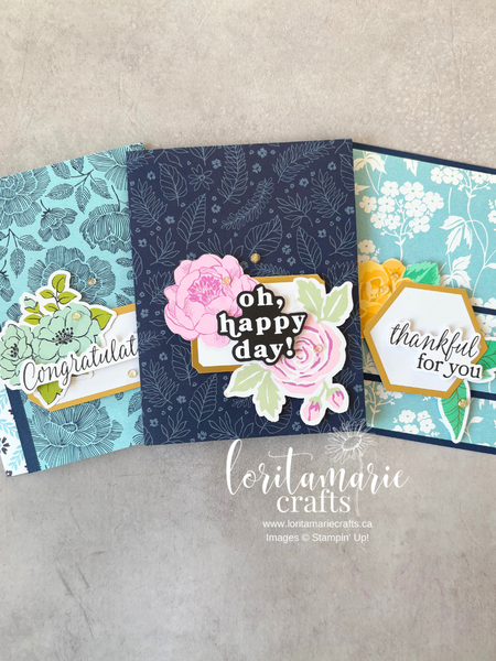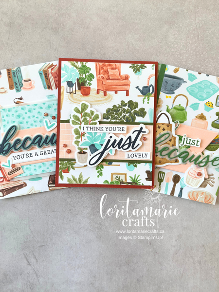I've used the fun Hobby Haven Specialty DSP, but these can easily be adapted to your favourite paper. These cards are also my Weekly Class to Go.